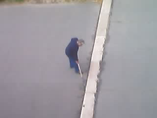 Barátunk elvágtázott a kis "műhelyébe", ahol valószínűleg elég jól leitta magát (később erős piaszag áradt belőle). Ez idáig még talán rendben is van, csakhogy ő délután úgy gondolta, hogy most akkor elkezd dolgozni. Kiment a suli elé ásóval, és megpróbált gödröt ásni a betonba. Nem tudom, hogy a gödörásást - mégha földet ás is - miért gondolta értelmes munkának, de sebaj, délután fél négyig ott próbálkozott rendületlenül lyukat ásni a betonba és a lépcsőkbe. Kép is készült róla, de sajnos megint a másodikon volt óránk, onnan lett fényképezve mobillal, és a zoom miatt eléggé szétesett, de azért látszik rajta a lényeg.