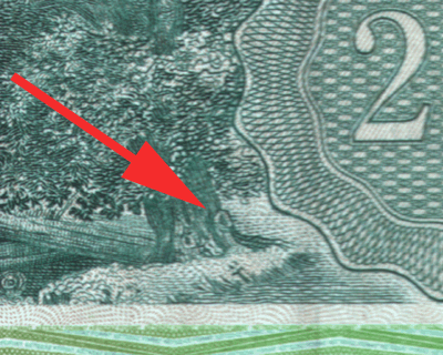 Tetszik látni azt a furcsa dolgot ott, a fa tövében, jobb oldalt? Igen, az ott egy fasz. Úgy került oda, hogy kirúgtak egy grafikust, és az utolsó munkanapján bosszúból odarajzolta ezt a kis kiegészítést az egyébként óriásplakátnyi méretben készülő pénzre. A régi ötezresen is volt egy hasonló kis rejtett meglepetés, nagyítóval jól ki lehet venni az Akadémia oszlopsora mögött egy parkoló Skodát.