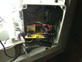 Az üvegfal mögött egy műanyag lap lapult, ez tartotta a plakátot, mögötte pedig fénycsövek meredeztek. A zenélő szerkezet meglepően egyszerűnek bizonyult: egy műanyag doboz, benne egy kis erősítő, némi elektronika, egy közönséges, boltban kapható MP3 lejátszó, s mindehhez egy hosszú élettartamú zselés akkumulátor. Hát, ennél bonyolultabbra számítottam! Egyébként nem érdemes nekiállni szétverni a plakátokat az MP3 lejátszóért, ki vannak herélve, a vezérlésük beleintegrálva az eszközbe. (Ha valakit egyébként érdekel a lejátszó doksija, tessék, az is rajta volt.)